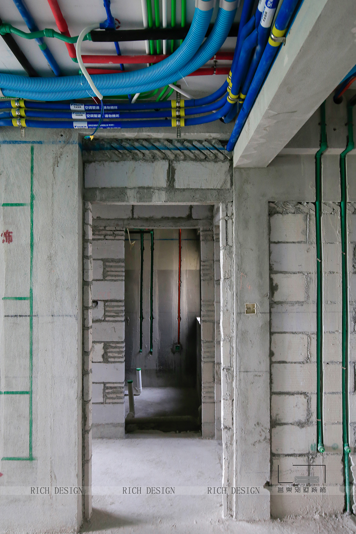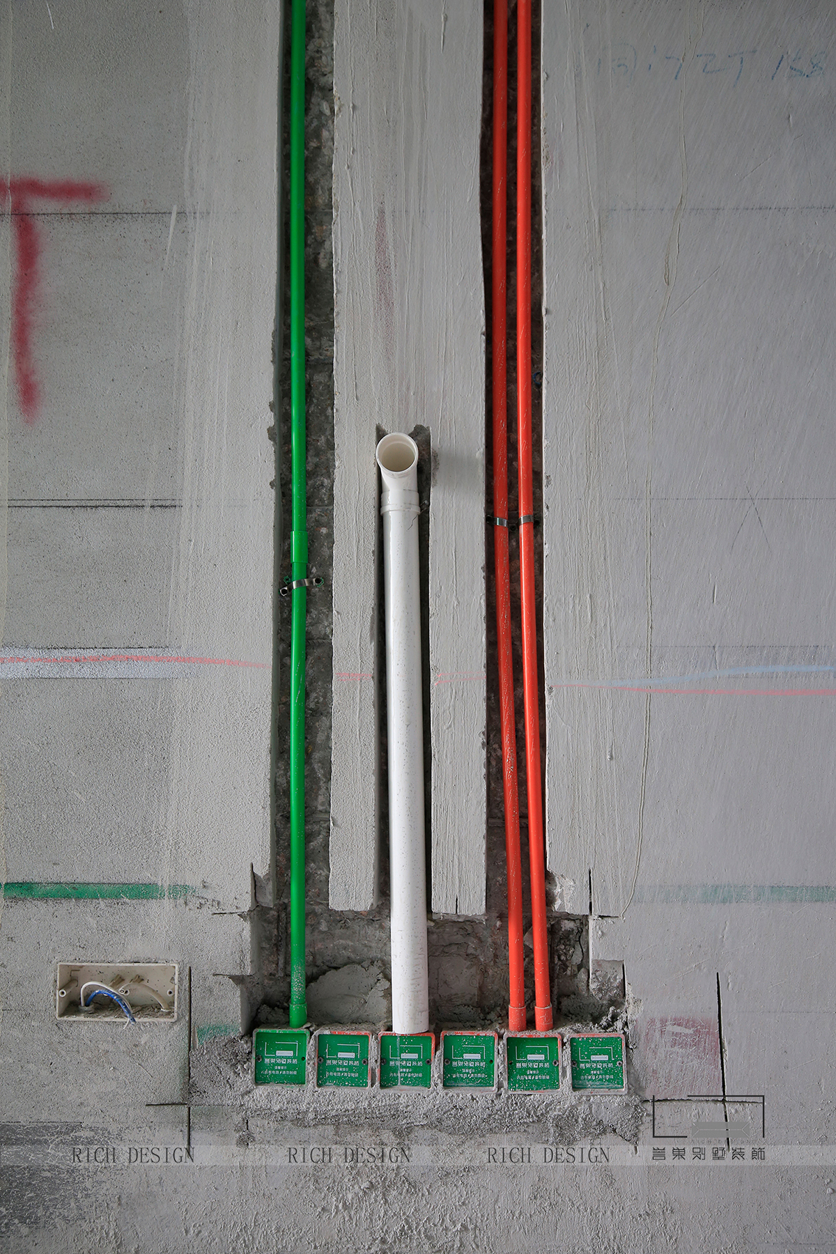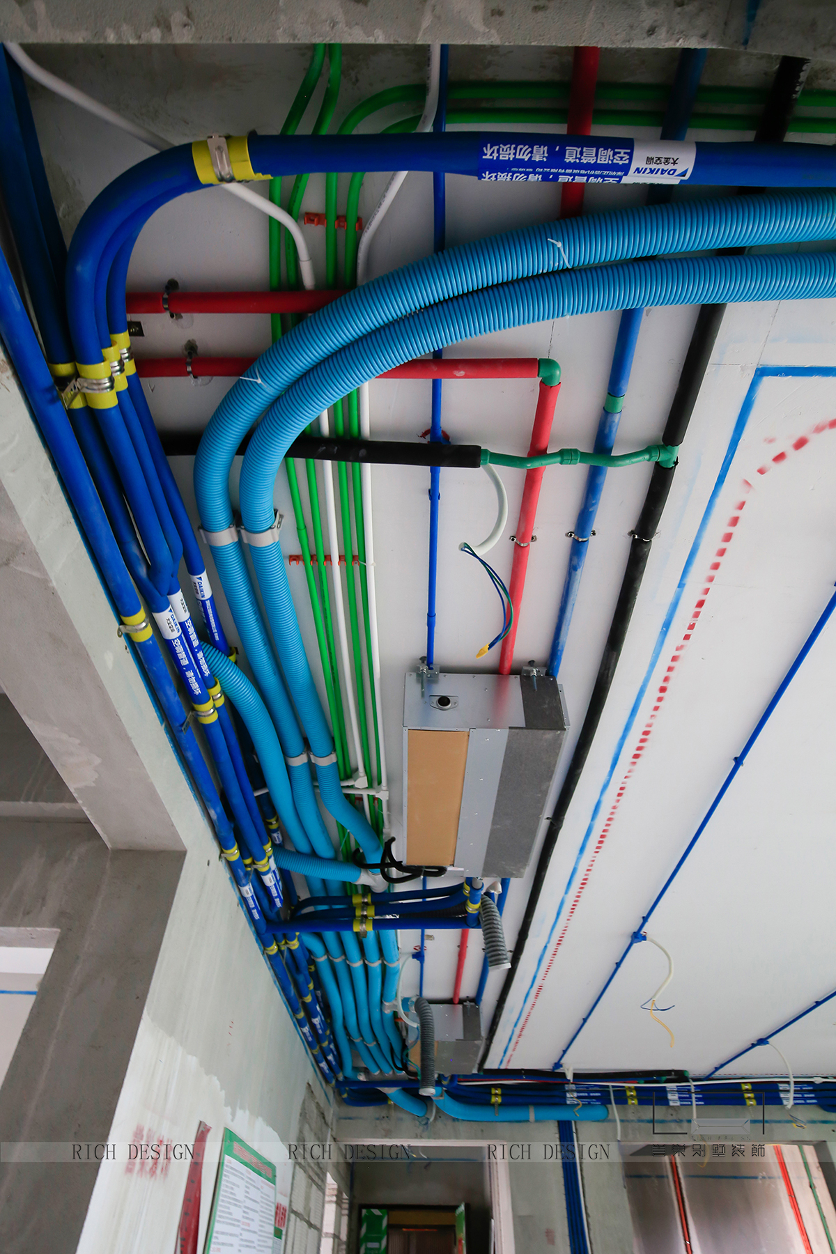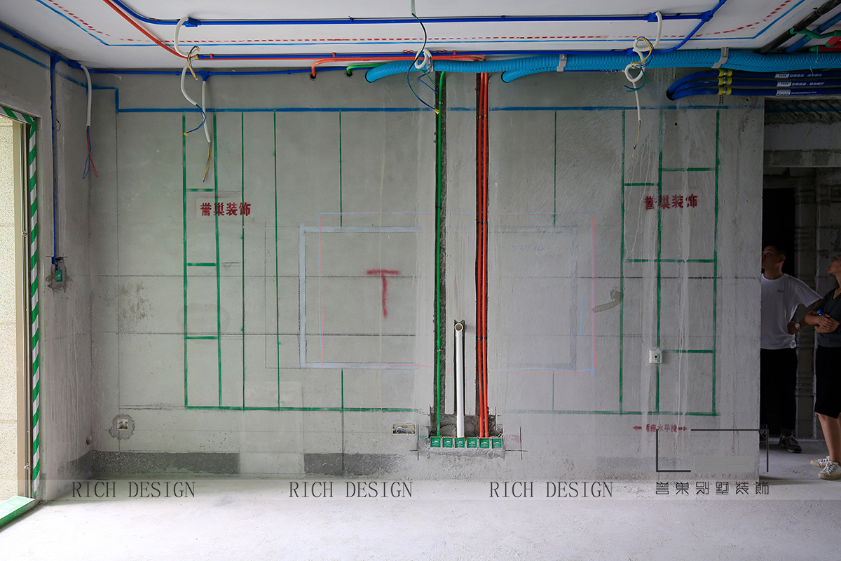 在水電項(xiàng)目的時(shí)候,電路管道布設(shè)時(shí),電源插座線路使用紅色PVC線管,照明路線使用藍(lán)色PVC線管,弱電線路使用綠色PVC線管。