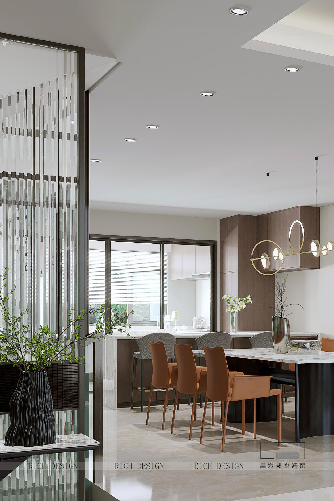 以大地色位主色調(diào)表達(dá)溫馨感,電視背景墻以木色條紋大理石巖板表現(xiàn)疏朗感,再以黃銅金屬圓圈吊燈作為點綴,節(jié)奏清晰分明,進而打破單調(diào)界限。